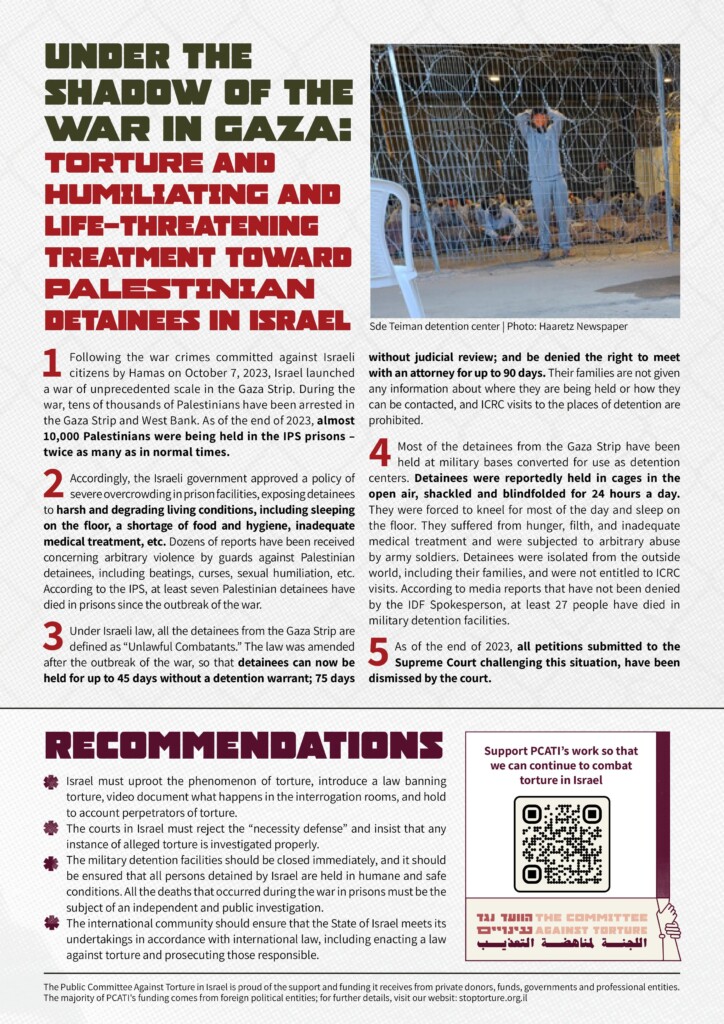 كما أن انتهاكات حقوق الأسرى سواء المواطنين أم السكان غير المواطنين في إسرائيل هي حالة دائمة، وهي ممنوعة أيضًا بموجب ذات القوانين والأنظمة التي تحظر التعذيب.